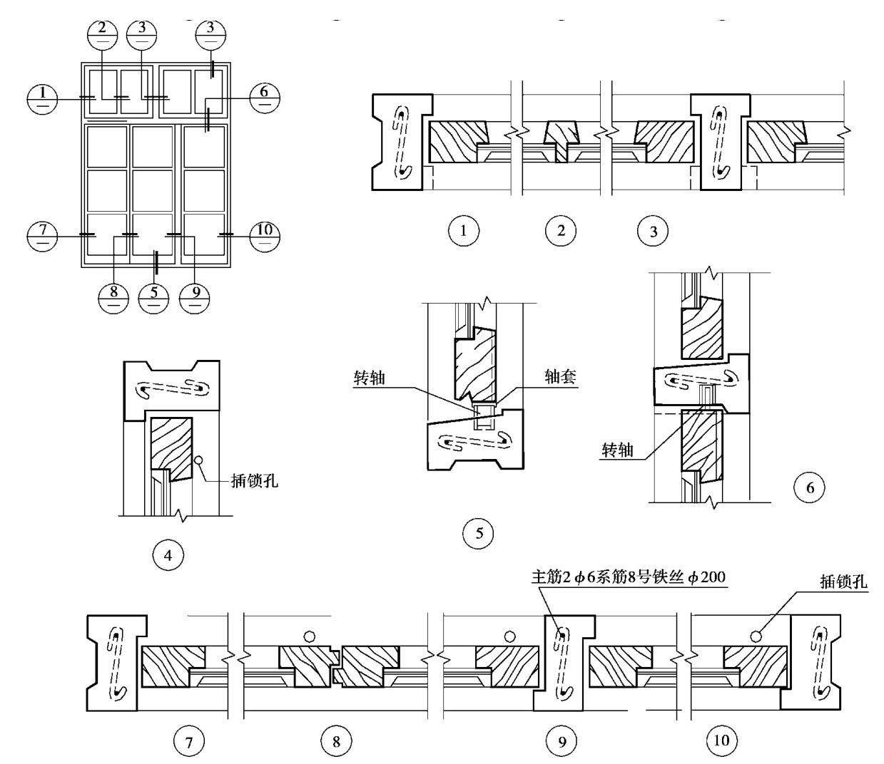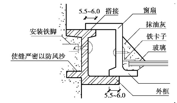 钢筋混凝土侧窗目前主要用作固定窗,也有在上设部分钢或木窗扇。 一般窗框用C20混凝土制作,内配2ϕ6钢筋,用8号镀锌铁丝作系筋(图16.38)。