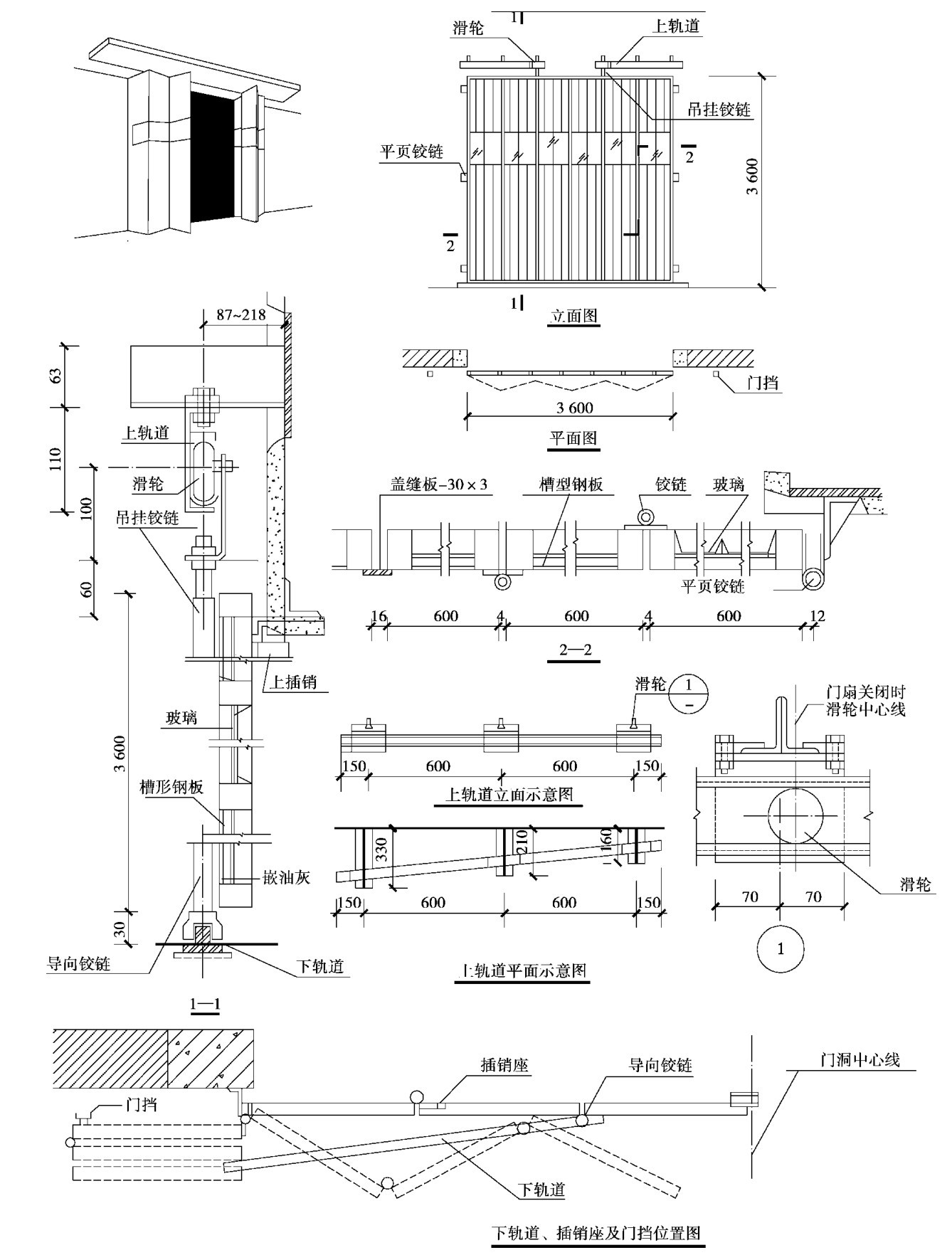 上翻门由门扇、平衡锤、滑轮、导轮、导向滑轮及门框等组成。 门扇可用钢板、空腹薄壁钢板以及钢木等材料制作。 门扇骨架用冷轧带钢高频焊管制成。 拉杆为ϕ22钢管,其一端固定于轨道上,另一端固定于门扇的骨架上。 两侧垂直轨道用槽钢制作,为减轻平衡锤重,设有减重导向滑轮组。 重锤直轨拉杆式钢木上翻门构造如图16.48所示。