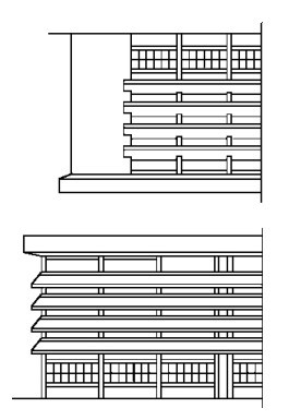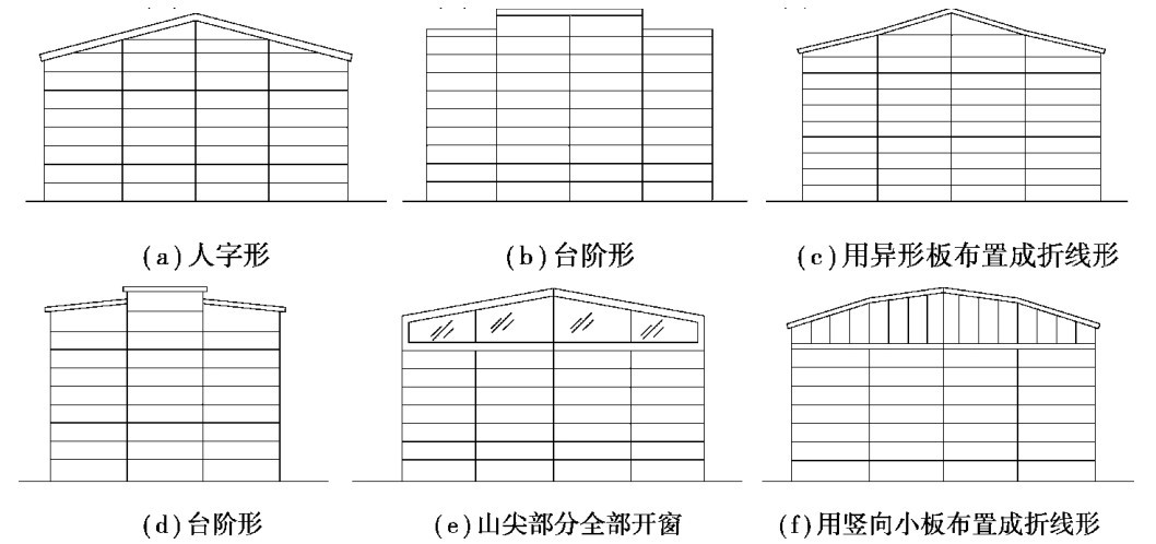 厂房的山墙上形成山尖形,从立面设计要求可做出多种处理方案(图16.11)。 在山尖部分用砖、混凝土块等砌筑,为了立面统一,可抹灰画线,形成墙板的形象。