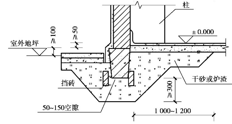 ③基础梁底的回填土一般不需夯实,并应留有不少于100mm的空隙,以利于基础梁随柱基础一起沉降。 在寒冷地区为防因土冻胀致使基础梁上隆而开裂,应在基础下及周围铺一定厚度的砂或炉渣等松散材料,同时在外墙周围做散水(图16.4)。