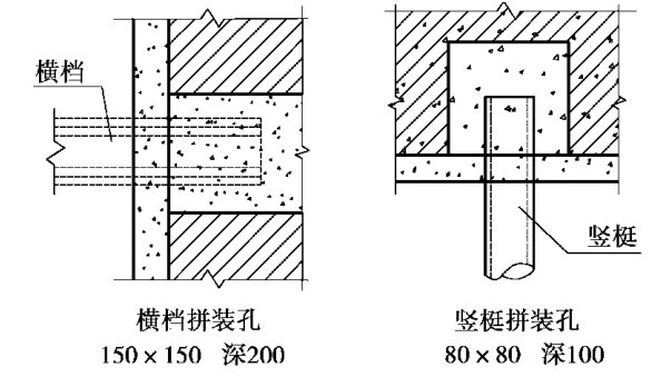 组合窗以单向组合为宜。 横向组合时,一般在相邻框预留对应拼装孔中插ϕ6短筋,然后用1∶2水泥砂浆填实锚固,若组合窗宽度大于3600mm时,需加设预制钢筋混凝土小柱作竖梃。 竖向组合时,一般用预制钢筋混凝土T形拼条作横档;若组合窗宽度大于3600mm时,需用钢筋混凝土过梁来作横档,以保证刚度。