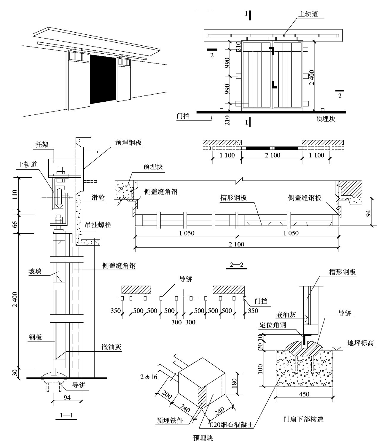 工业厂房的大门一般均有国家标准图供选用。 现仅介绍单层厂房多采用的平开式门和推拉式门与民用建筑不同的构造做法,对其他较常用的门只作简单介绍。