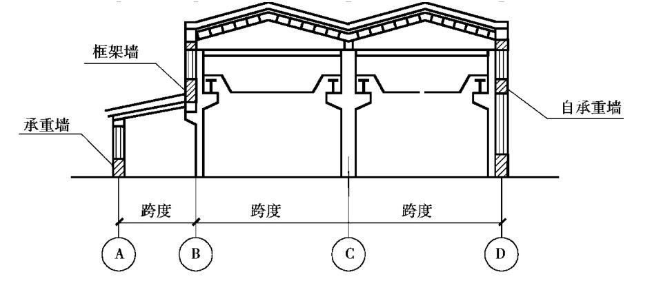 单层厂房的外墙按材料可分为砖墙、砌块墙、板材墙等;按承重方式分为承重墙、自承重墙、框架墙等(图16.1)。