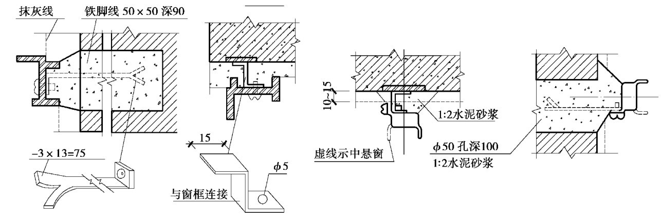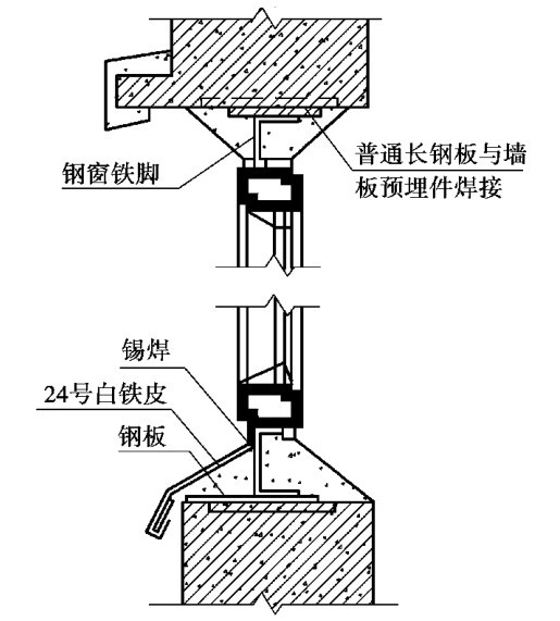 钢窗框与窗洞四周墙体的连接,一般是在墙上预留50mm×50mm×100mm的洞。 把鱼尾铁脚一端插入洞内,用1∶2水泥砂浆或C15细石混凝土填实;另一端用螺栓与窗框固定。 每边第一只铁脚位置距框边180mm,其余等分(中距约500mm)。 若周边墙体不便预留洞时(如墙体为大型墙板或窗顶为钢筋混凝土过梁等),则需按铁脚位置在墙体或过梁上预埋铁件,安装时用连接件与窗框焊接(图16.37)。 窗框固定后,窗框四周与窗洞间空隙须用1∶2水泥砂浆填实,以免透风渗水。