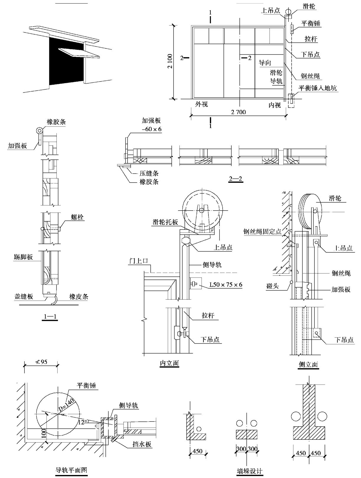 图16.48 重锤直轨拉杆式钢木上翻门构造