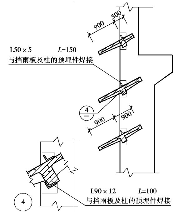①有支架型 一般采用钢筋混凝土支架,上设钢筋混凝土板。 支架与柱、支架与板均通过预埋件焊接固定,适用于高温车间(图16.30)。