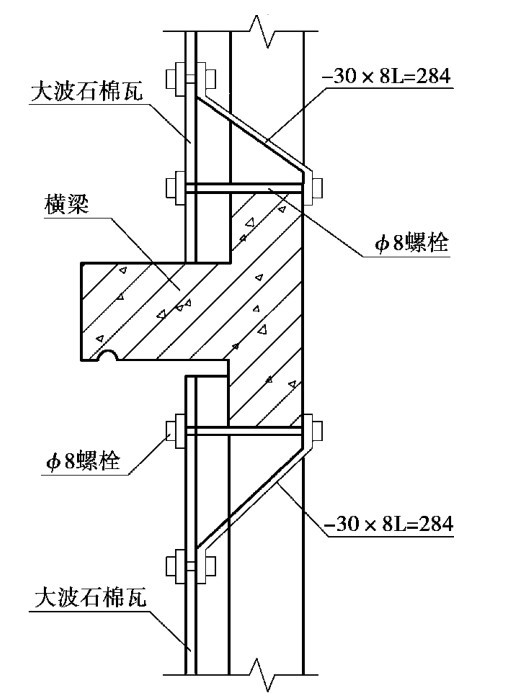 对不要求保温、隔热的热加工车间、防爆车间等的外墙,可采用石棉水泥板、瓦楞铁皮、塑料墙板、铝合金板以及夹层玻璃墙板等。 这类墙板仅起围护作用,除传递水平风荷载外,不承受其他荷载,其本身重量也由厂房骨架来承受。 目前多采用的是波纹石棉水泥瓦,它通常悬挂在柱间的预制钢筋混凝土横梁上。 横梁两端是置于柱子的钢牛腿上,并通过预埋件与柱子焊接牢固。 横梁的间距应与波纹石棉水泥瓦的长度相适应。 横梁与瓦板可采用螺栓与铁卡连接(图16.25和图16.26)。