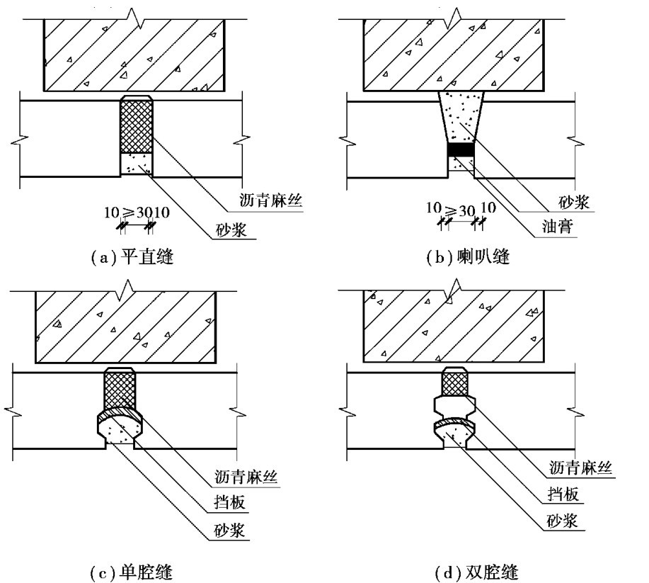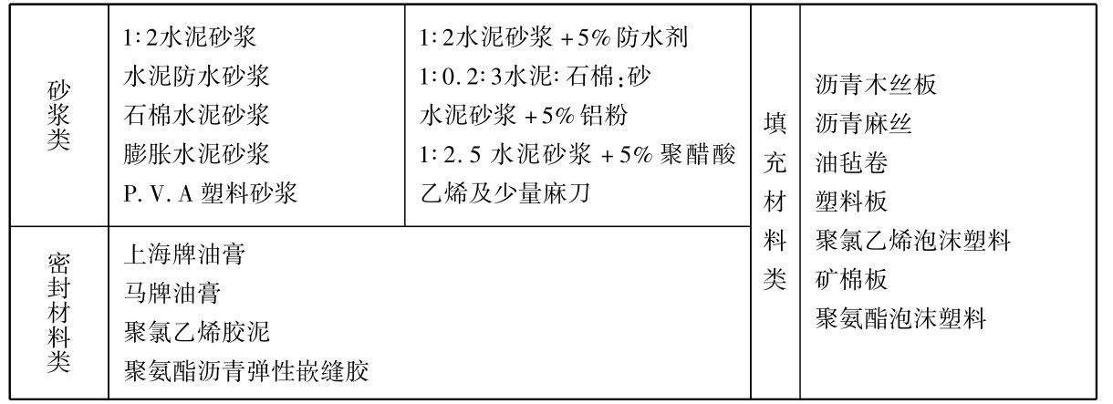 板缝的处理应满足防风雨、保温隔热、便于制作、施工方便、坚固耐久、经济美观等要求。因此,板缝宜采用构造措施防风雨,用砂浆勾缝或选用防水材料堵塞板缝。 对防水要求较高的,可将上两种方法结合使用。 对吸水率大的轻骨料混凝土墙板,在板接合处应预刷防水涂料。 对要求保温的墙板,要用有保温性能的材料填充,并应作双面嵌缝。 为避免毛细管作用引起渗漏,嵌缝材料不可将整个板缝填满,应留有空腔。 对有振动较大成沉降不均匀的厂房,嵌缝应参考表16.1,选用弹性较好的材料嵌填。