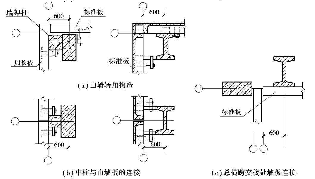 ③转角与山墙墙板的连接 转角与山墙墙板的布置与连接有多种方式,设计时需作比较,力求与墙面主要部分统一协调,墙板类型少,安装方便,支承和连接可靠。 山墙与厂房承重柱间的空隙常用附加柱填充,也可在厂房承重柱上设钢支托和水平承压杆支承。 对山墙转角处墙板,一般是将山墙加长,如为使山墙边板也使用标准板,则另加补充转角构件,它与标准板之间要用铁件相连接。 补充构件也可用砖、砌块或现浇混凝土等替代(图16.20)。