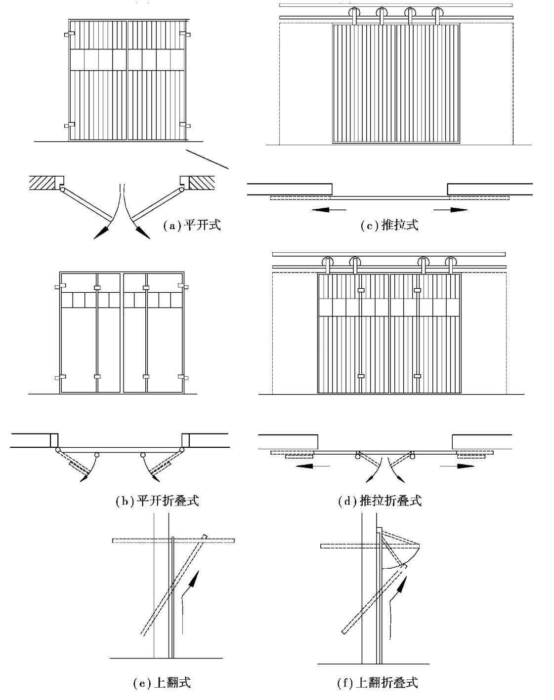 ③按开启方式分有平开门、推拉门、平开折叠门、推拉折叠门、上翻门、升降门、偏心门、卷帘门、光电控制门等(图16.42)。