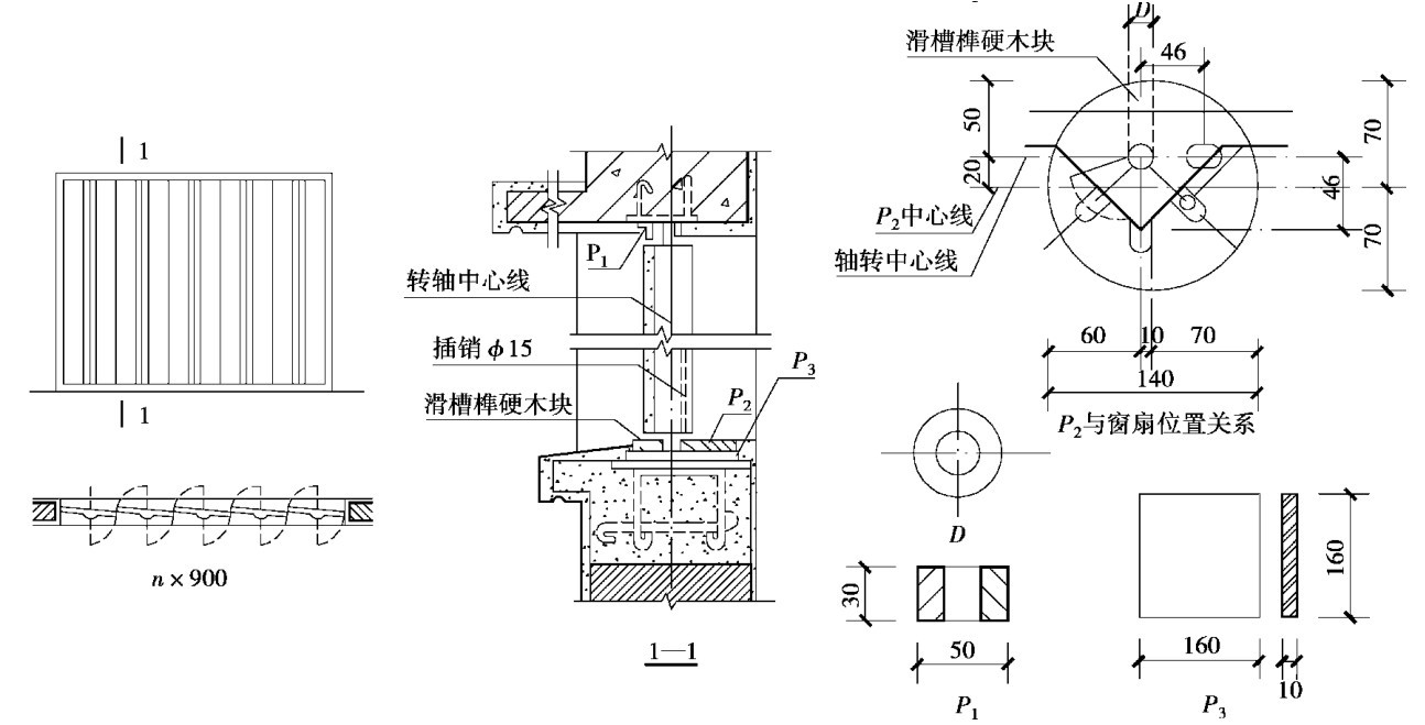 该类窗为无框结构,通风板窗扇中心上下两端设磨圆的主轴钢筋,上部套入由钢管或钢板组成的转轴座,下部插入钢插销板的中心孔内。 钢插销板上设有不同开启角度的孔洞,使用时根据风向,利用插销和不同的插销孔位,使其与墙面分别形成0°,45°,90°和135°的夹角(图16.39)。
