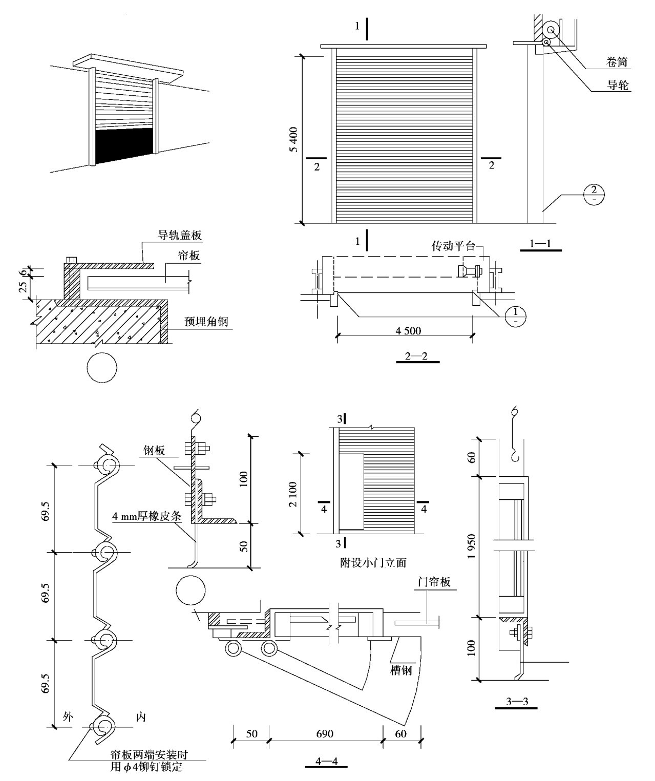 卷帘门由卷帘板、导轨、卷筒和开关装置等组成。 门扇为1.5mm厚带钢轧成的帘板,板间用铆钉连接。 为保其坚固耐久,门扇下部采用10mm厚钢板,并附设橡皮条以防风沙。