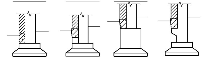 ②基础梁搁置在杯形基础顶的方式,与基础埋置深度不同。 当基础杯口顶面距室内地坪为500mm时,基础梁可直接搁在杯口上;当基础杯口顶面距室内地坪>500mm时,可设置C15混凝土垫块搁于杯口顶面来供基础梁放置,垫块宽度当墙厚为240mm时其宽为300mm,墙厚为370mm时为400mm;当基础很深时,可设置高杯口基础或在柱上设牛腿来搁置基础梁(图16.3)。