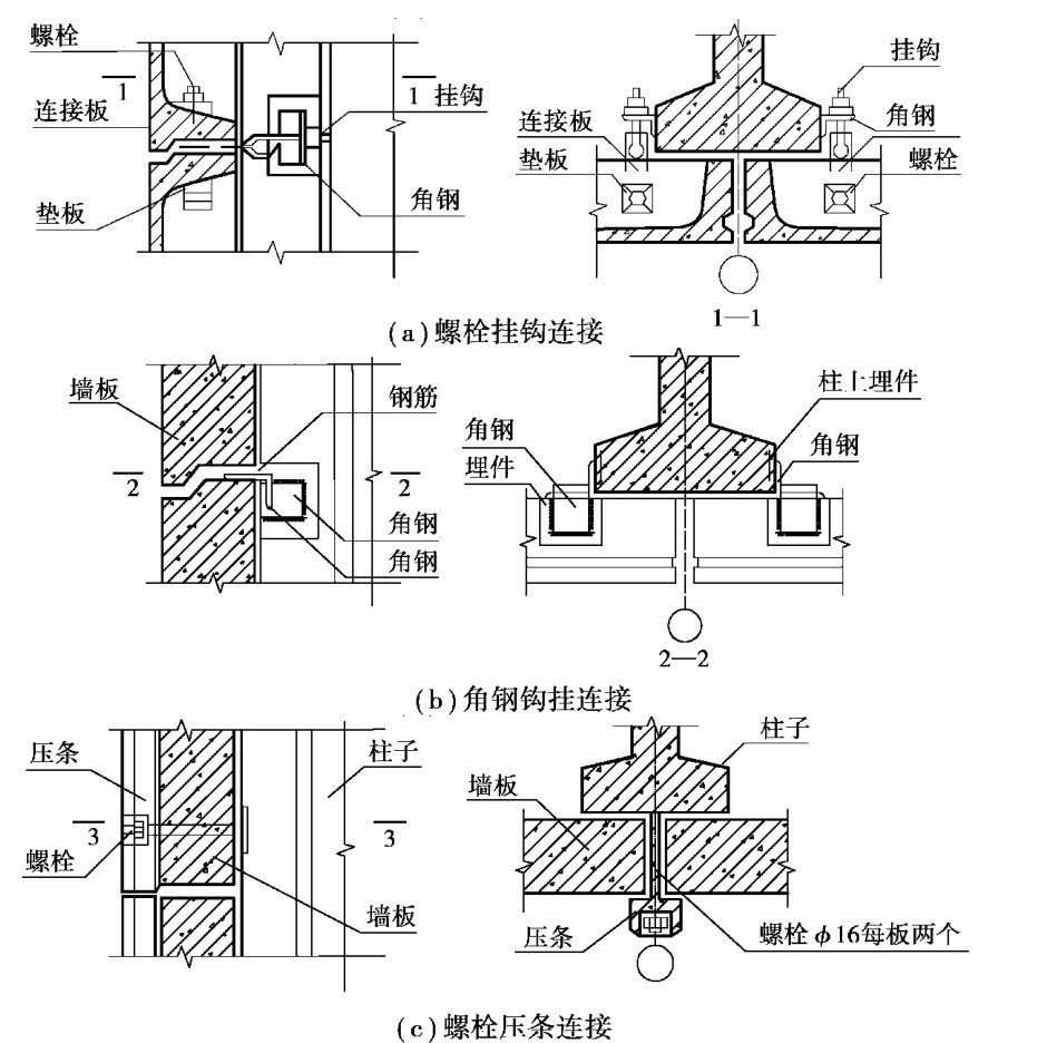 墙板的柔性连接构造形式较多,其中最简单的为螺栓连接和压条连接两种做法(图16.12):螺栓连接是在水平方向用螺栓、挂钩等辅助件拉接固定,在垂直方向每3~4块板由焊于柱上的钢支托支承。 这种连接构造使墙板与柱在一定范围内相对独立位移,能较好地适应振动(包括地震)引起的变形。 但厂房的纵向刚度差,安装固定要求准确,较费工、费钢材。 压条连接是在墙板外加压条,与焊于柱上的螺栓墙板和柱压紧拉牢。 压条连接适用于对预埋件有锈蚀作用或裹力较差的墙板,如粉煤灰硅酸盐泥混凝土板,加气混凝土板等。 其优点是墙板中不需另设预埋铁件,构造简单,省钢材,压条封盖后的竖密封性好。 其缺点是螺栓的焊接或膨胀螺栓质量要求高,施工较复杂,安装时墙板要求在一个水平面上,预留要求准确等。