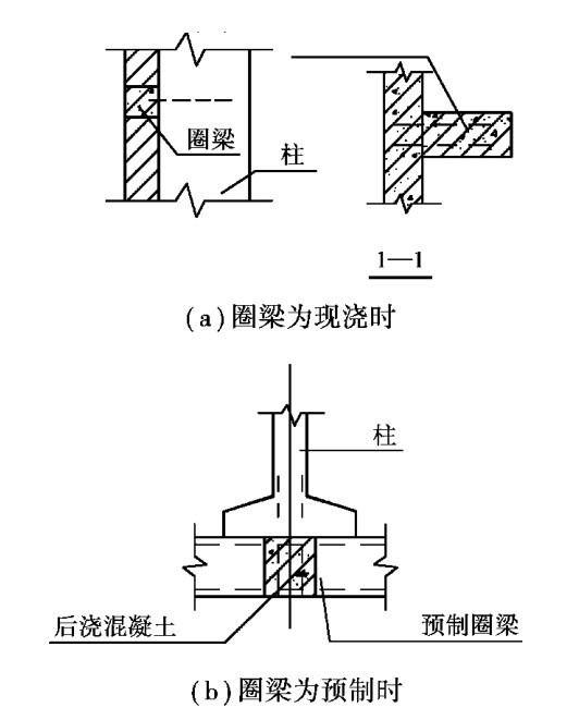 按厂房高度、荷载和地基条件等,需将一道或几道墙梁沿厂房四周串通,一般称为圈梁。其作用是增强厂房结构的整体性,抵抗因地基不均匀沉降或较大振动荷载所引起的变形。 圈梁应尽可能兼作窗过梁用。 圈梁截面常为矩形或L形,可预制或现浇,与柱的连接构造如图16.6所示。