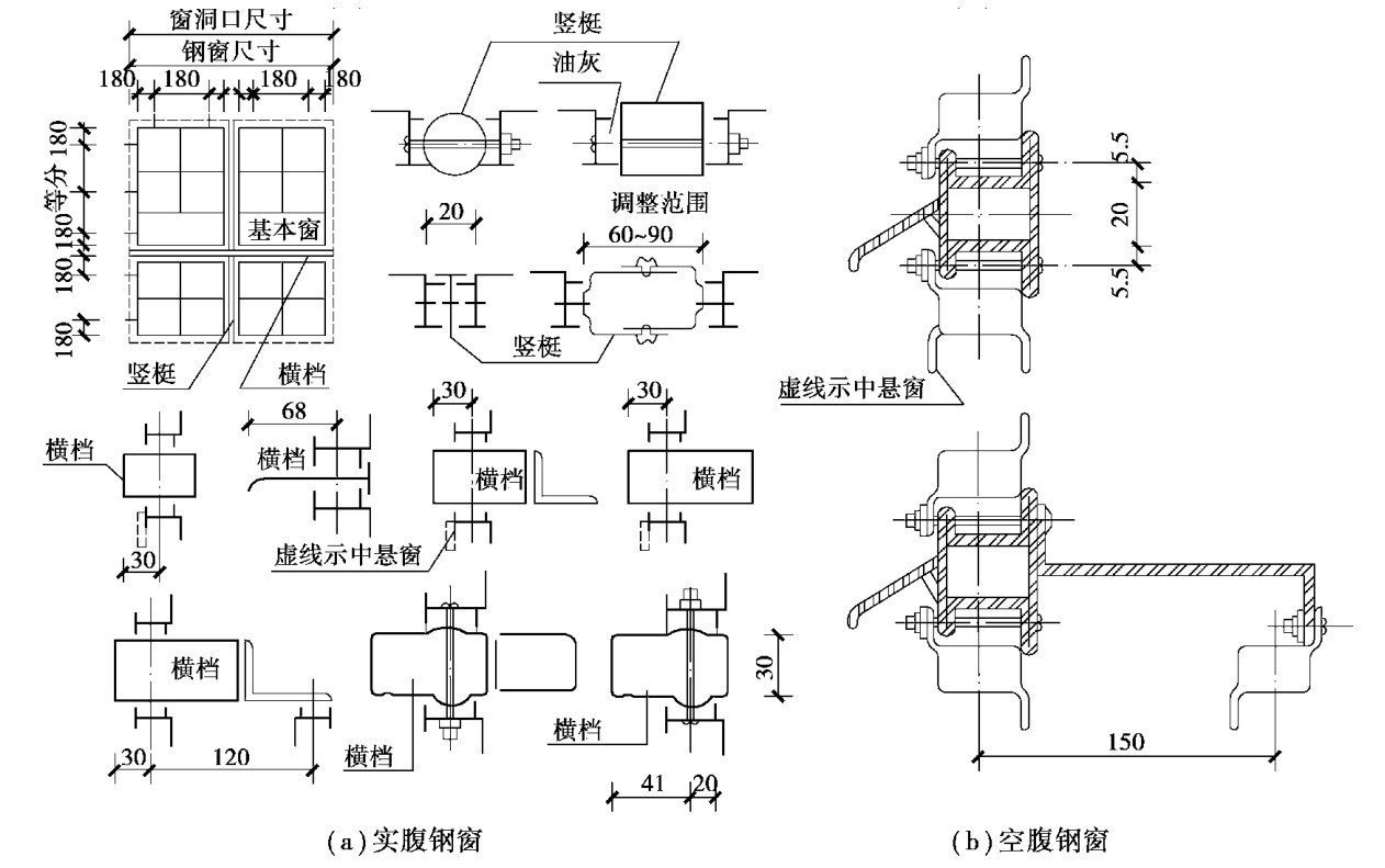 ①窗料 工业建筑中使用的实腹钢窗料一般为32mm。 当窗面积较大时,则采用40mm窗料。 空腹薄壁钢窗料有25mm×36mm京66型和27.5mm×37mm沪88型两种,其质量轻、抗扭强度高,但因壁薄,不宜用于有酸碱介质侵蚀和湿度较大的车间。