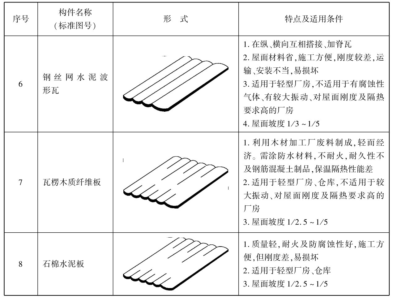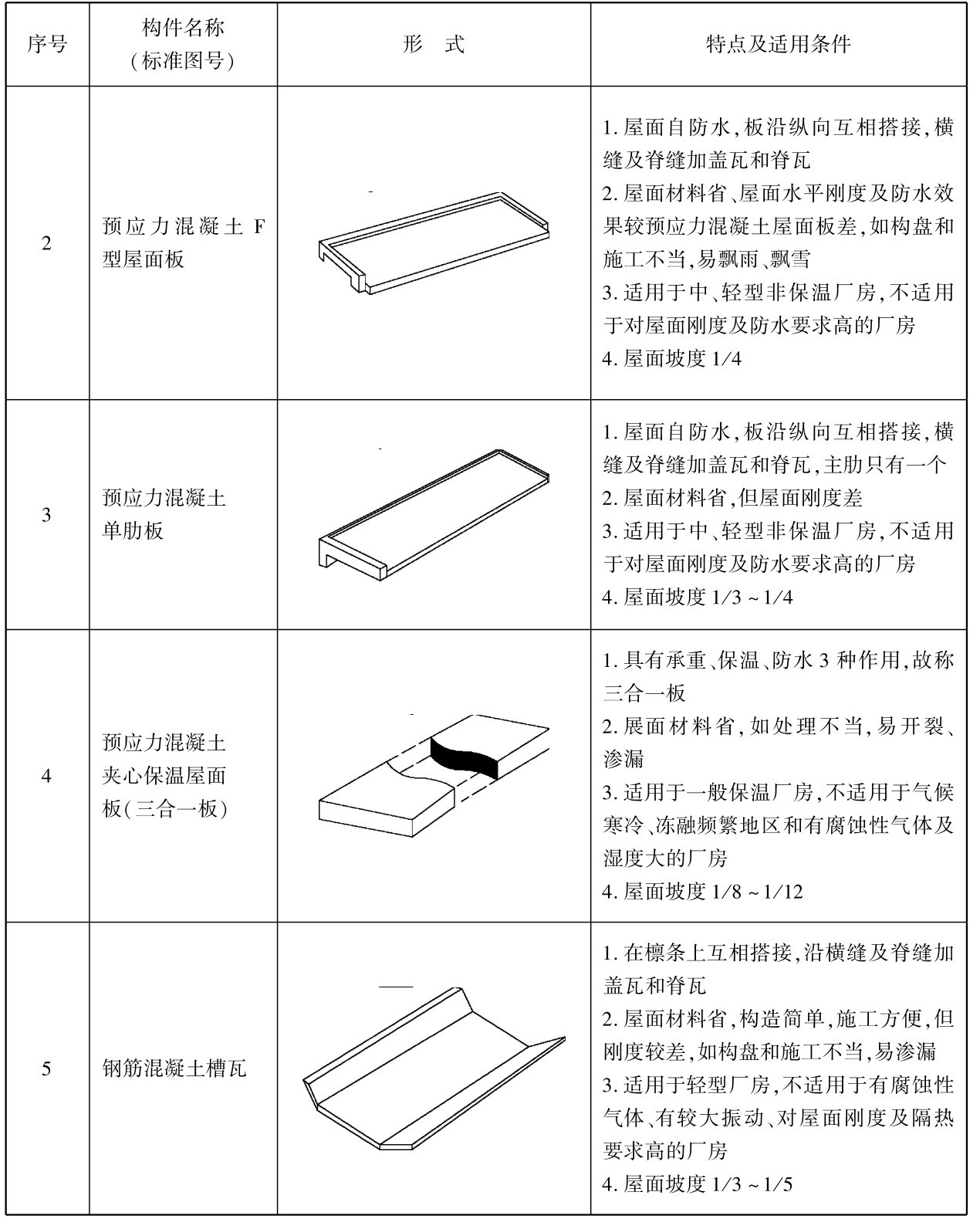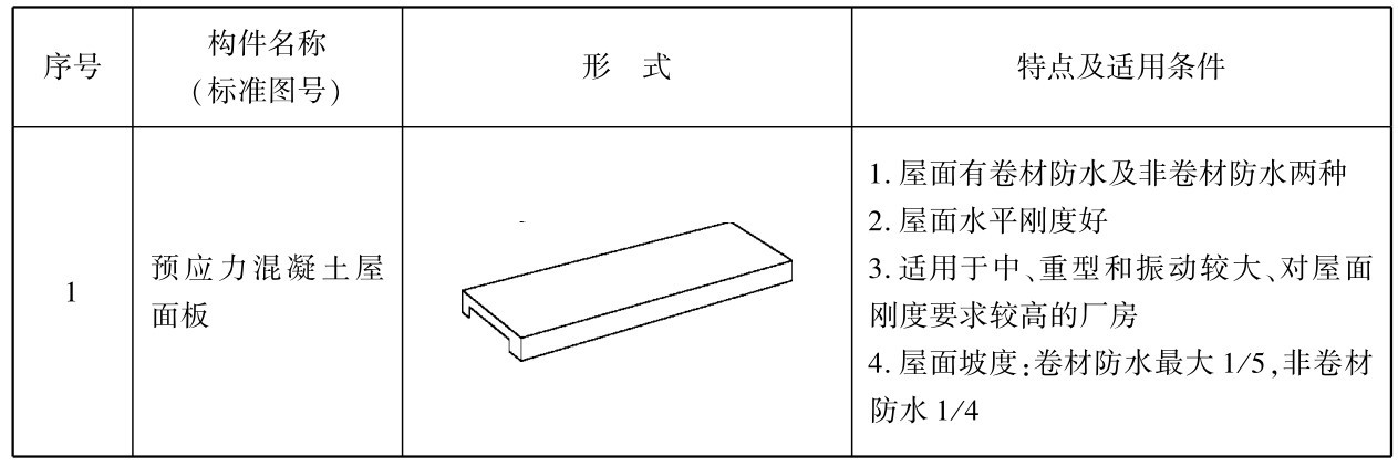 无檩体系屋盖的屋面是指表16.3中序号1—4大型屋面板。 目前,厂房中应用较多的预应力混凝土大型屋面板,其外形尺寸常用的是1.5mm×6mm,为配合屋架尺寸和檐口做法,还有0.9m×6m的嵌板和檐口板。 有时也采用3m×6m,1.5m×9m,3m×9m,3m×12m的屋面板。