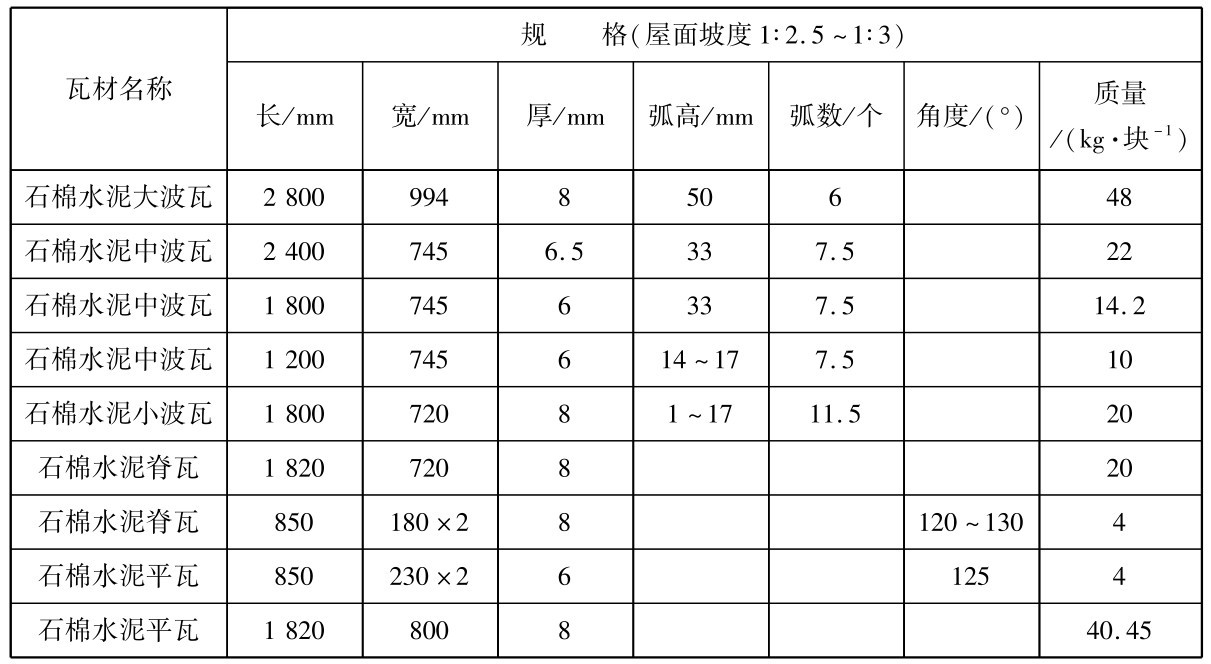 石棉瓦屋面质量取决于瓦材质量。 一般用的短纤维石棉瓦坚固、耐久较差,保温和隔热性能也较差,故多用于不需要保温隔热的厂房;长纤维石棉瓦虽好,但价格较昂贵。 仿石棉瓦形的波形塑料瓦、玻璃钢瓦、木纤维瓦、金属瓦等也可选用。 塑料瓦、玻璃瓦质轻,且半透明,可作屋顶采光使用但老化问题有待解决。 木纤维瓦轻、弹性好,但耐火度稍欠。 金属瓦具有质轻、抗震、防水好的优点,如薄钢板、铝板也可做成瓦楞压型板,但造价偏高。