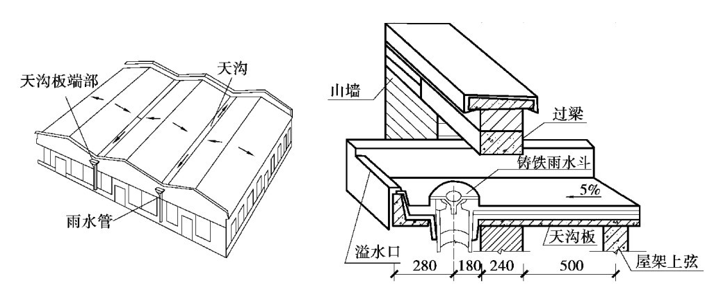 ②长天沟外排水 在多跨厂房中,为了解决中间跨的排水,可沿纵向天沟内厂房两端山墙外部排水,形成长天沟外排水(图16.50(a))。 长天沟板端部作溢流口,以防止在暴雨时因来不及泄水而使天沟浸水(图16.50(b))。