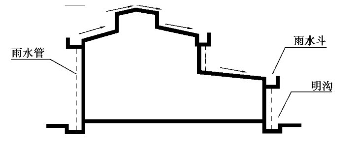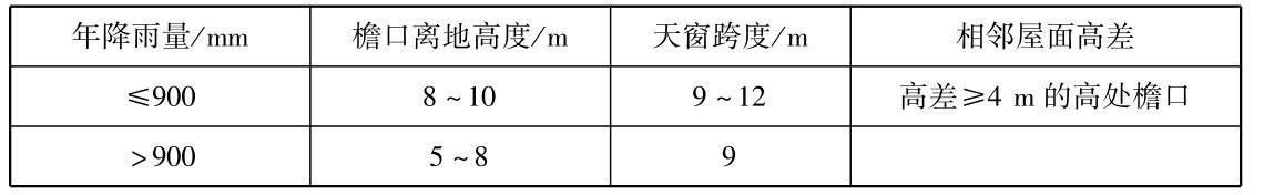 ④如立面处理需做女儿墙的厂房可做有组织内排水。 在寒冷地区采暖厂房及在生产中有热量散发的车间,厂房外檐也宜采用有组织内排水。