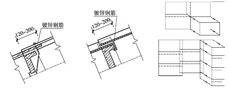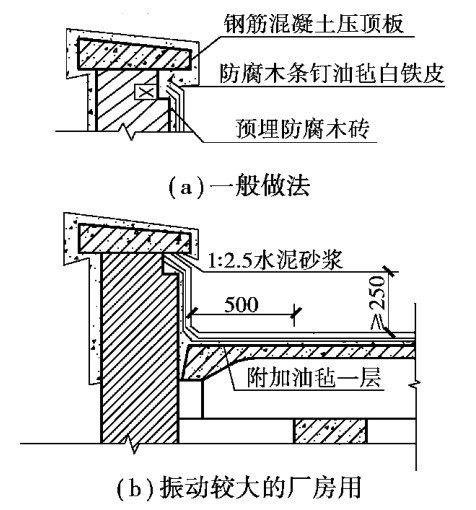 出墙泛水的做法与民用建筑大同小异,一般建筑的做法如图16.54(a)所示,有较大振动的厂房的做法如图16.54(b)所示。 墙上的压顶板为装配整体式或现浇,起拉结墙顶的作用,防水效果好。