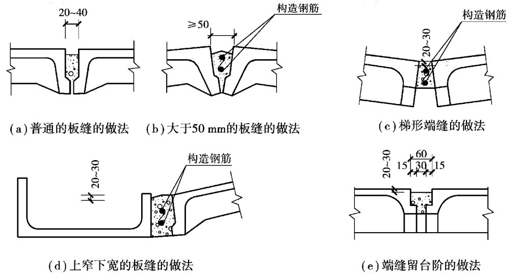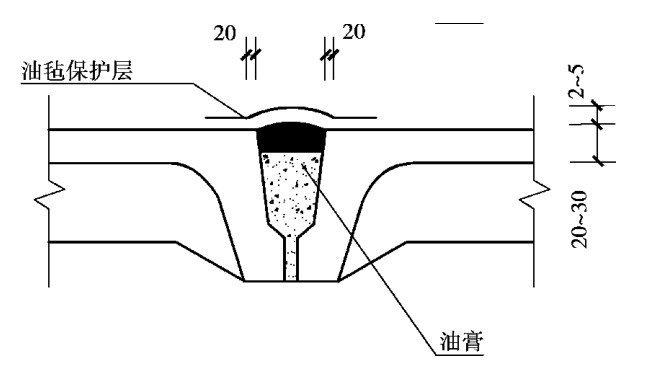 为了保证板缝处不漏水,要满足以下构造要求:①增强屋面板刚度。 因此刚度差的屋面板挠度大,板端翘曲变形也大,使板缝开裂。 因此自防水屋面板的刚度应适当加强。 其方法是一方面加大屋面板的高度,如将高度为240mm的一般单层厂房大型屋面板高度增大至300mm;另一方面是增大II型屋面板板面的厚度,由一般的25mm厚增加为至少30mm厚。 另外采用预应力大型屋面板也是减少挠度的有效办法。 ②屋面板板缝的大小应适当。 在工程实践中,为了保证细石混凝土嵌缝牢固,板缝上口宽度应为20~40mm(图16.56(a))。 当板缝宽度大于50mm时,板缝内必须设构造钢筋,以防止灌缝混凝土开裂(图16.56(b)、(e))。 屋面板的端缝宜做成台阶形(图16.56(d));当端缝出现上窄下宽呈梯形断面时,必须加构造钢筋(图16.56(c))。 灌缝细石混凝土不应低于C20,缝口不能灌满,至少预留20mm的深度,用以嵌封油膏。 ③板缝嵌油膏要做好保护层,板缝需选用质量稳定、性能可靠的油膏嵌封。 常用的有聚氯乙烯胶泥和建筑防水油膏两种。 油膏的覆盖宽度,每边至少要超过板缝20 mm(图16.57)。 嵌缝后,再沿缝作保护层,以提高嵌缝材料的耐久性。 保护层的做法常见的有4种:一是用玛蹄脂粘贴油毡条;二是用稀释的油膏粘贴玻璃布,表面再涂刷稀释油膏;三是涂刷防水涂料;四是涂刷稀释的油膏或加铺绿豆砂作保护层。