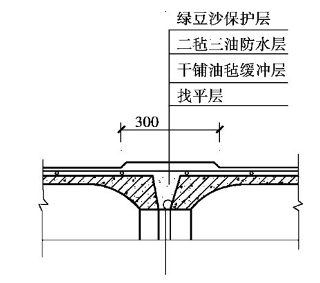 卷材防水屋面在构造上基本与民用建筑相同。 但值得注意的是,当采用大型钢筋混凝土屋面板做基层的卷材防水屋面、板缝,特别是横缝,不管屋面上有无保温层,均开裂相当严重。一般在大型屋面板或保温层上做找平层时,最好先将找平层沿横缝处做出分格缝,缝中用油膏填实,缝上先干铺一条300mm宽油毡缓冲层,再铺油毡防水层,使屋面油毡在基层变形时有一定的缓冲余地,对防止横缝开裂有一定的效果(图16.53)。