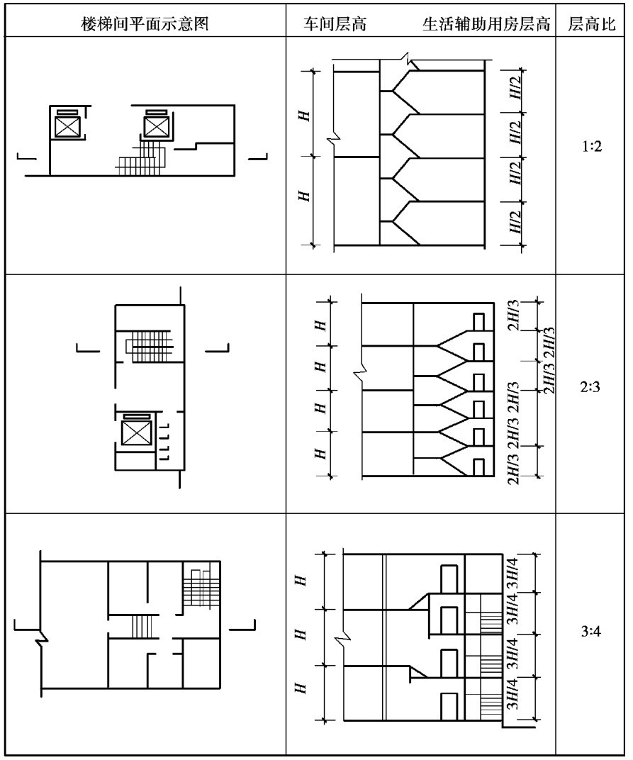 多层厂房的交通枢纽和生活、辅助用房的布置,按其和厂房平面位置的相互关系,一般有毗连式、车间内部式和独立式3种,它们和单层厂房生活间布置的特征相类似。 但当采用毗连式和车间内部式布置时,由于生活间的层高比生产车间的层高低,为了合理利用建筑空间,常降低生活间的层高(一般在2.8~3.2m之间)以便较多地布置生活、辅助用房。 车间与生活间层高之比,常采用的有1∶2,2∶3及3∶4数种。 但错层布置会增加剖面的复杂性和使用上的不方便,也将增加结构、施工的麻烦。 由于能节约建筑空间,仍被广泛采用,如图17.6所示为生活、辅助用房与车间不同层高的布置形式。