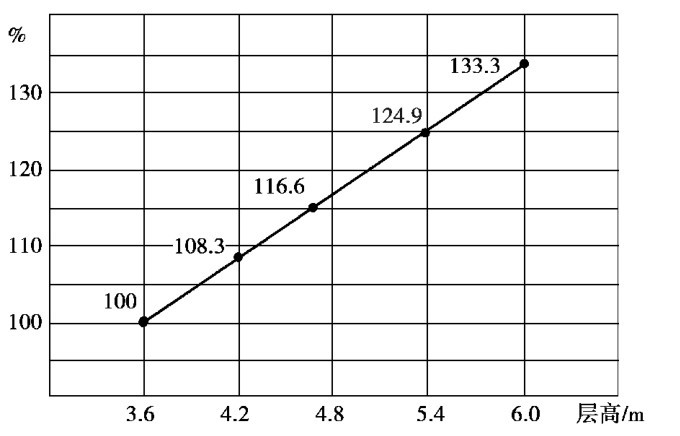 ⑤层高与经济的关系 影响厂房层高除上述因素外,还应从经济角度予以考虑,如图17.10所示表明不同层高的单位面积造价的变化是向上的直线关系,即层高每增加0.6m,单位面积造价提高8.3%左右。