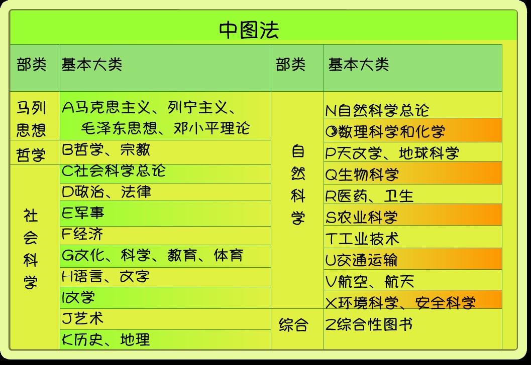 同学们想要方便快捷的找到自己喜欢的图书,要先了解中图法。《中图法》是《中国图书馆分类法》的简称,是当今国内图书馆使用最广泛的分类法体系,包括“马列主义、毛泽东思想,哲学,社会科学,自然科学,综合性图书五大部类,在五大部类的基础上,又分成二十二大类,而每个大类下面又细分为很多小类,例如,T工业技术大类具体又分为十六小类。