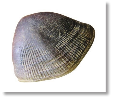 形:扇形,宽端有纵纹及横线纹,窄端光滑;内表面滑润,中部有一条弓形的横向棱形