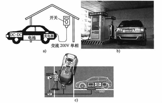 根据充电时的能量转换方式可以分为接触式和感应式,上述充电设备直接连接汽车都属于接触式。感应式充电是利用高频交流磁场的变压器原理,将电能从车外感应到车内,以达到给电池充电的目的。感应充电(图2-34c)的最大优点是安全,这是因为充电器与车辆之间并无直接的点接触,即使车辆在恶劣的气候下,如雨雪天,进行充电也无触电的危险。近几年国外研究的汽车无线充电方式,公路上行驶的电动汽车可通过安装在电线杆或其他高层建筑上的发射器快速补充电能。其原理就像在车里使用的移动电话,将电能转换成一种符合现行技术标准要求的特殊的激光或微波束。电费将从汽车上安装的预付卡中扣除。