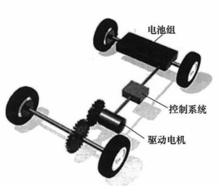 当汽车行驶前进时,电池组输出的直流电经电机控制系统变为交流电后供入驱动电机,电机输出的转矩经传动系统驱动车轮。