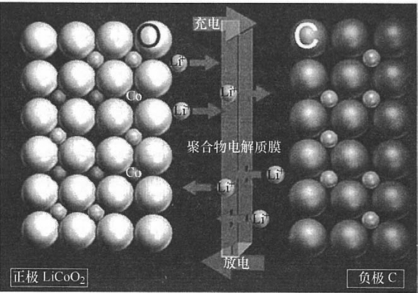 2)工作原理(图2-30)。当电池充电时,锂离子从正极中脱嵌,经过电解质嵌入负极,负极处于富锂状态。放电时则相反。Li+在两个电极之间往返嵌入和脱嵌,被形象地称为“摇椅电池”。