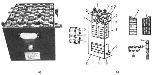 1-正极板;2-接线柱;3-加液口盖;4-绝缘导管;5-负极板;6-吊架7-单格电池连接条;8-极板骨架;9-绝缘层;10-镀镍薄钢板;11-外壳;12-通孔13-活性物质;14-正极板导管;15-氢氧化镉
