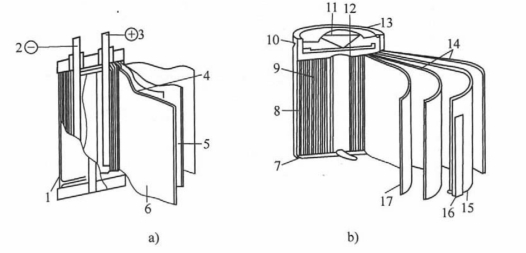 1-外壳;2-负极端子;3-正极端子;4、14-隔膜;5、16-负极板;6-正极板7、9-绝缘体;8-负极柱;10-密封圈;11-顶盖;12、17-正极;13-安全排气阀;15-负极