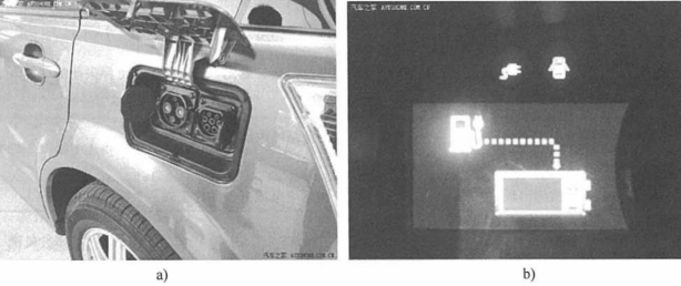 比亚迪e6电动汽车电池充电接口在汽车侧面,左侧是380V插口,右侧是220V插口(图2-37a)。充电时,仪表板会亮起相应的指示灯(图2-37b)。