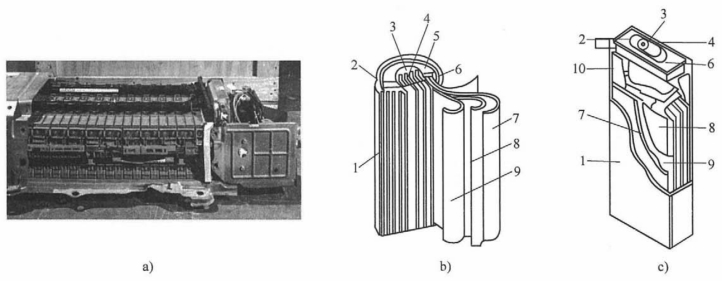 a)普锐斯电动汽车镍氢电池;b)圆柱形电池;c)方形电池