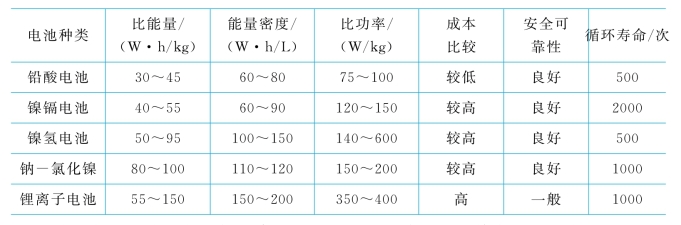 电池是EV的唯一能源,对汽车运行起决定性作用。目前广泛应用的动力电池有铅酸电池、镍氢电池、镍镉电池、钠氯电池和锂离子电池等,其主要性能指标见表2-3。