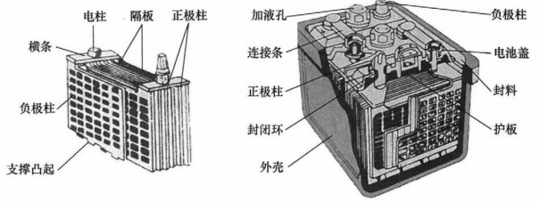 极板组是由单片极板组合而成,单片极板又由极栅和活性物质构成,极栅常用铅锑合金制成,正极的活性物是二氧化铅(Pb O2),负极的活性物质是海绵状纯铅(Pb)。