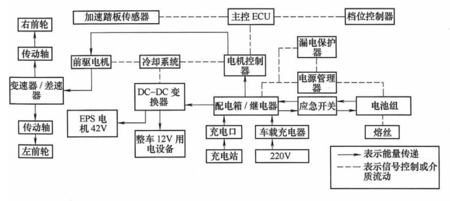 电源接通,汽车前进时,主控ECU接收档位控制器、加速踏板和角度传感器等各方面信息,传递给电机控制器,以控制流向前驱电机的电流,此时电池组电流通过应急开关、配电箱/继电器之后,一路经过电机控制器向前驱动电机供给需要的电流,从而使驱动电机运转,通过变速器/差速器和传动轴,带动左右前轮转动,使汽车行进;另一路经过DC-DC转换器,将电池组330V高压直流电转换为低压42V,提供给电动转向系统EPS使用。同时电池组接受电池管理器管理,将电池组的瞬时电压、电流、温度、存电情况等信息传递给电源管理器,以防止电池组过放电或温度过高损坏电池组。如果发生漏电情况,漏电保护器起作用。一旦发生紧急短路等情况,保护装置熔丝即熔断保护。