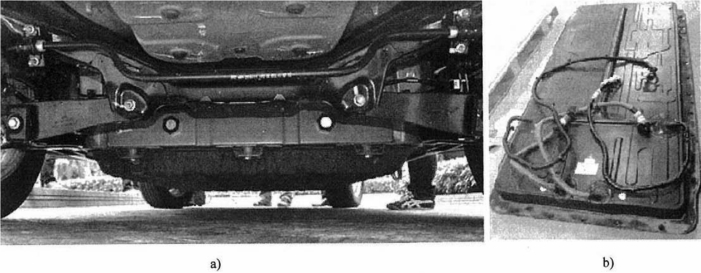 3)比亚迪e6纯电动汽车电池组。e6纯电动汽车采用磷酸锂钴铁电池,简称铁电池,也是锂电池的一种,它放在汽车底部(图2-31),由90个单体电池组成,总电压307V,电池容量达220A·h,可以使续驶里程达到300km。电池组相关技术参数见表2-4。