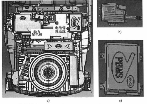 a)汽车发动机室;b)动力配电箱;c)电池管理系统