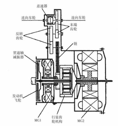 (1)由电动机/发电机1(MGI)、电动机/发电机2(1VIG2)和行星齿轮机构组成的混合动力贯通轴,如图3-16所示。