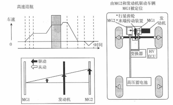 (7)高速巡航。在这一模式中,MG1的轴被定位于车辆静止的车梁上,驱动系运行在纯转矩耦合模式。发动机和MG2共同牵引车辆,如图3-33所示。