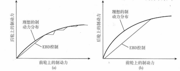 (1)前后轮制动力分布(2004和新型Prius)。通常,当施加制动时,车辆的载重向前位移,减少了后轮上的载荷。当滑移控制ECU检测到这一情况(基于车速传感器的输出)时,它发送信号给制动执行机构,调节后制动力使车辆在制动期间保持于控制之下。施加在后轮上的制动力量值将按减速率大小而变化,它也根据道路情况而变化。图3-33(a)和图3-33(b)分别描述了当后轮上没有载荷和有载荷时前后轮上的制动力分布。