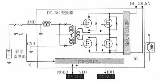 当MG1或MG2用作发电机时,AG变换器将任何一个发电机所发出的交流电变换为直流电。然后,升压变换器把该电压降压为DC 201.6 V,向高压蓄电池充电。