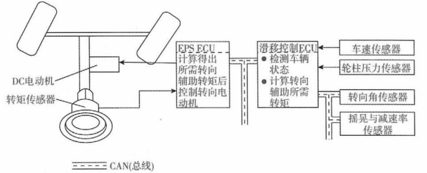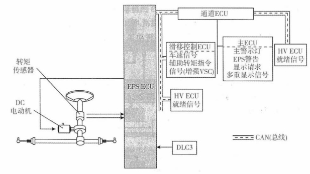 当发动机关闭时,一个12 V电动机驱动电动转向(EPS)装置,其结果使转向感觉不受影响。EPS ECU应用转矩传感器输出,并与滑移控制ECU有关车速和转矩辅助指令信号一起,确定转向和辅助动力。然后,相应地驱动该DC电动机。EPS系统的结构如图3-25所示。