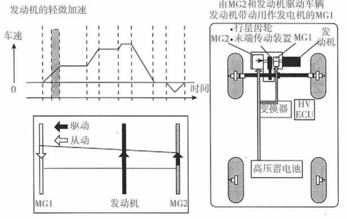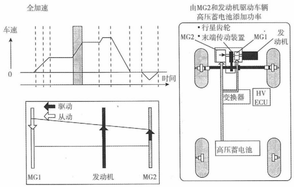 (3)在全加速期间,功率除由发动机提供外,还从高压蓄电池供电给MG1得到增补的功率。发动机转矩与MG2转矩相组合,提供加速车辆所需的功率。