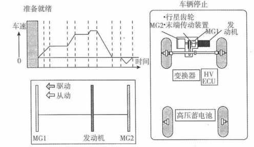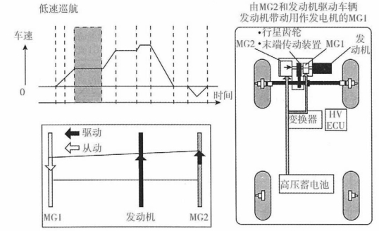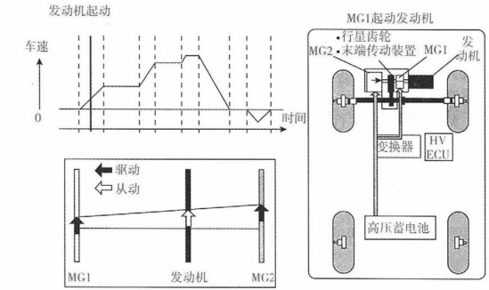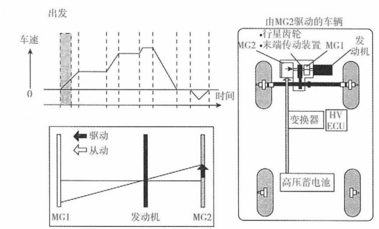 (1)当车辆出发,且以低速运行时,MG2提供主要的原动力。若高压蓄电池处于低荷电状态,则发动机可立即起动。一般,当车速增加至24~32 km/h范围时,发动机将起动运转。